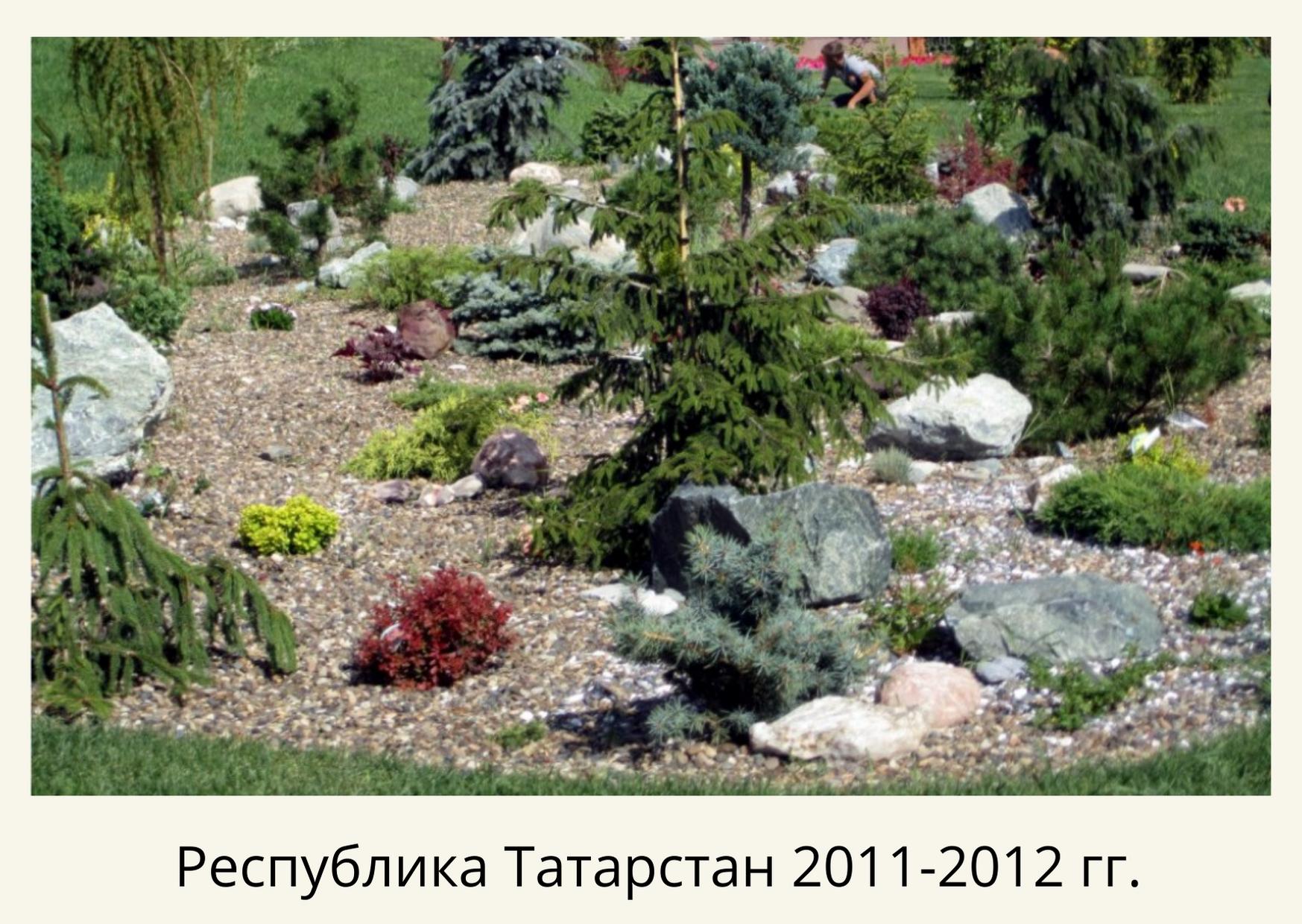 Территории были ухожены, но вместо газона – травяная поросль, цветники переросли, высажено много хвойных растений, но без видимой концепции. Мы постарались исправить данную ситуацию. Удалили сорняки, перекопали, завезли чернозем, постелили рулонный газон и частично отреставрировали существующий на площади 1,5 га. Пересадили и привели в порядок существующие насаждения. Сделали бордюрные цветники с однолетниками (петуния, тагетис, пеларгония, бегония) 10 000шт, рокарии, розарий из бордюрных голландских роз Патио и высадили декоративных хвойных и лиственных растений 1240 шт.